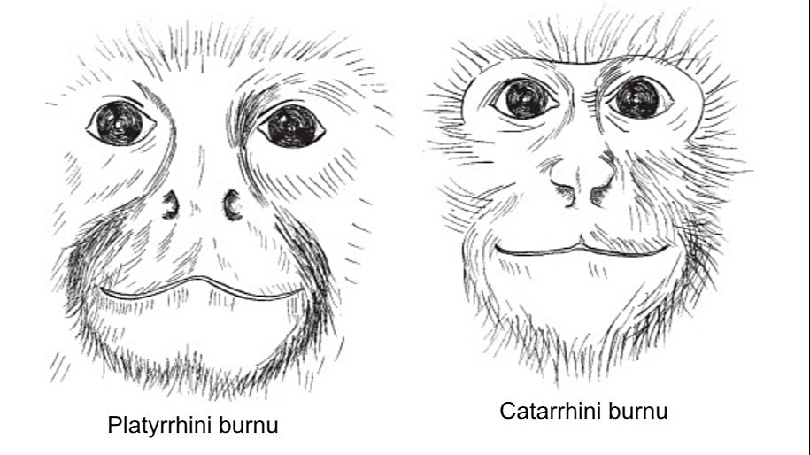 Antik Yunanca platu- "düz", rhin- ise "burun" demektir. Düz burunlu anlamına gelen Platyrrhini kullanılır. Burun delikleri yanlara ve dışa bakar. Antik Yunanca cata- "aşağı", rhin- ise "burun" anlamına gelir. Bu da aşağı burunlular anlamında kullanılır. Çünkü burun delikleri aşağı doğru bakar.