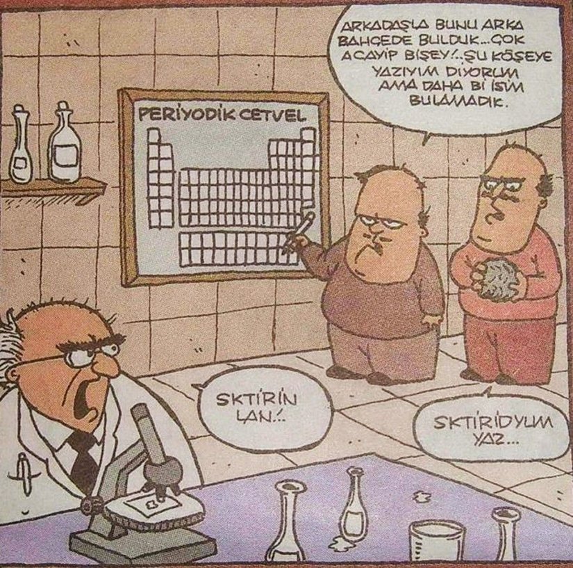 Ne yazıktır ki (ya da belki, "iyi ki de") yeni bulunan elementlerin isimlendirilmesi işi bu karikatürde gördüğünüz kadar basit bir olay değil. Yani söz gelimi Devrim Stadyumu’nda dolanırken ayağınıza çarpan bir maddeye bakıp “Aha da yeni element buldum, adını da dedemin anısına Hamdiyum koyacam!” demeyi beklemeyin! Tabii Rusya, A.B.D. ve Japonya’daki araştırma gruplarının sahip olduğu imkanlara siz de sahipseniz ve iki ayrı element atomunu birbirine muazzam bir kuvvetle fırlatıp yeni bir element elde etme imkanınız varsa, işler değişir.