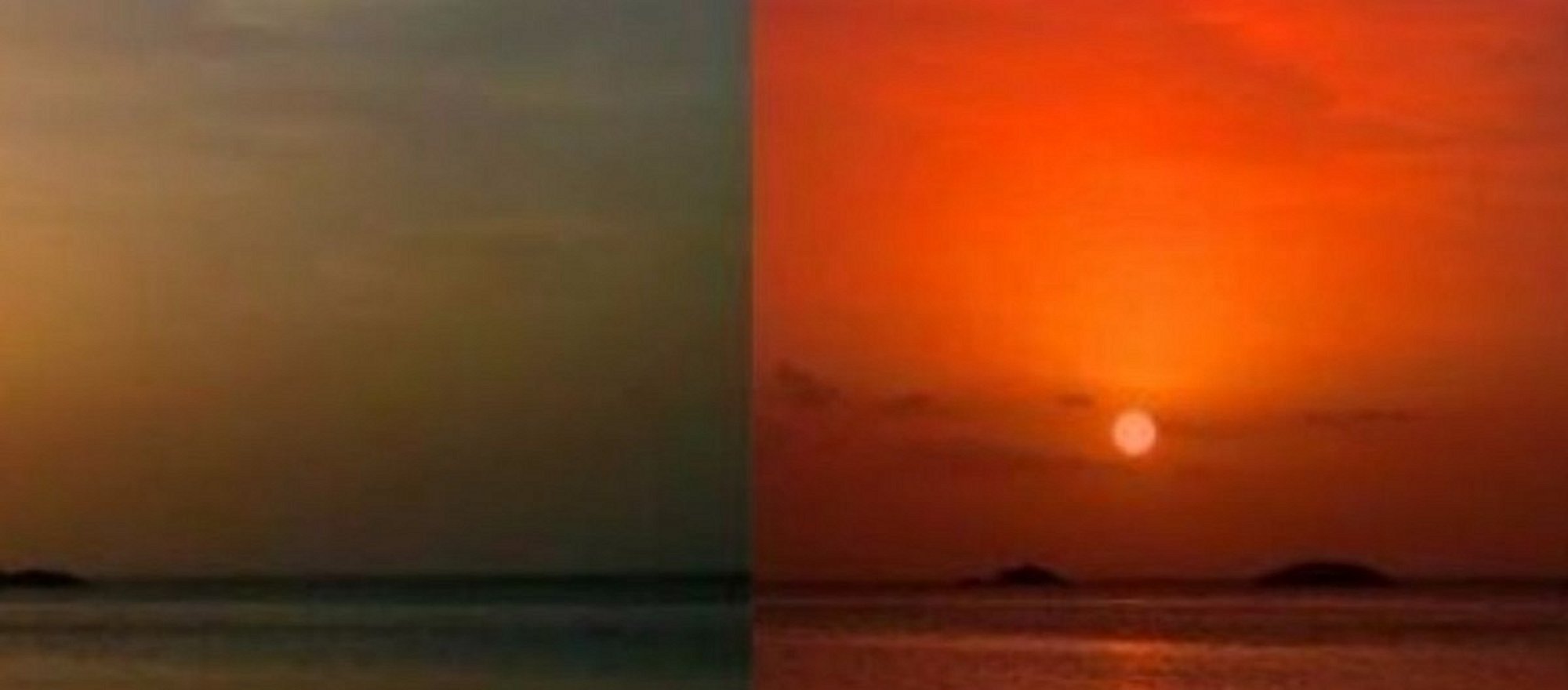 Sol tarafta Karayipler'de bir günbatımı gözüküyor. Sağ tarafta ise aynı görüntü, kuzen gezegenimizde meydana gelseydi nasıl görüneceği gösteriliyor. Görüntünün daha farklı olmasının nedeni, gezegenin atmosferiyle alakalı değil, çünkü muhtemelen kuzen gezegenin atmosferi bizimkine çok yakın. Ancak bu gezegenin döndüğü yıldız bir M-tipi cüce, dolayısıyla bizim Güneş'imizden aldığımızın 3'te 1'i kadar enerji alabiliyor. Bu da, gezegene ulaşan foton sayısının daha az olmasına neden oluyor.
