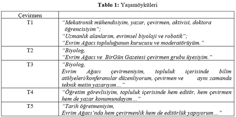 Netnografik saha çalışmasının merkezinde yer alan çevirmenlerin, eğitim bilgilerine bakıldığında, biyolog, uçak ve mekatronik mühendisi, nörolog, tarihçi ve akademisyen gibi kimliklerin öne çıktığı görülmektedir. Evrim biyolojisi ve ilişkili diğer alanlar kapsamında doktora eğitimlerini sürdüren katılımcıların yanı sıra, ilgili çevirmenlerin söylemlerinde robotik, eklem dokuları ve rejenerasyon evrimi gibi diğer uzmanlık alanları vurgulanmaktadır. İlgili topluluklarda yeniden çeviri pratiğini deneyimleyen görüşmeciler kendilerini çevirmen, yazar, teknik metin yazarı, editör ve evrim çalışkanı gibi farklı kavramlar etrafında tanımlamaktadırlar.