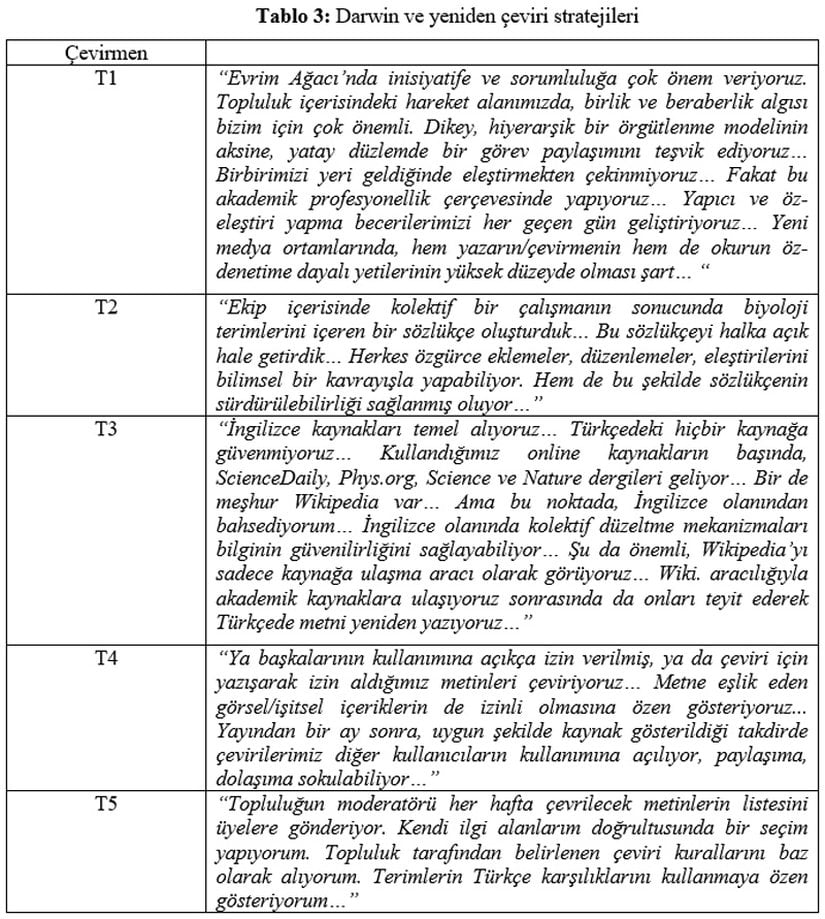 Netnografik araştırmanın son aşamasını oluşturan aşağıdaki soru kapsamında, ilgili çevirmenlerin, Darwin’i Türkçeye yeniden çevirirken uyguladıkları stratejiler çözümlenmektedir. Bu bağlamda, çevirmenler, gerek bireysel gerekse kolektif düzlemde benimsedikleri yeniden çeviri kararlarını şu kavramlar aracılığıyla açımlamaktadırlar (bkz. Tablo 3):
