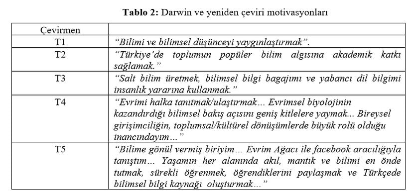 İkinci soruya gelindiğinde, çevirmenlere, çevrimiçi ağlarda yapılanan Darwin’i yeniden çevirme hareketleri ve bu yönde benimsedikleri motivasyon unsurlarının neler olduğu sorulmaktadır. Bu başlık altında, görüşmeciler, deneyimledikleri yeniden çeviri pratiklerine ilişkin tetikleyici ve motive edici unsurları şu sözlerle dile getirmektedirler (bkz. Tablo 2):