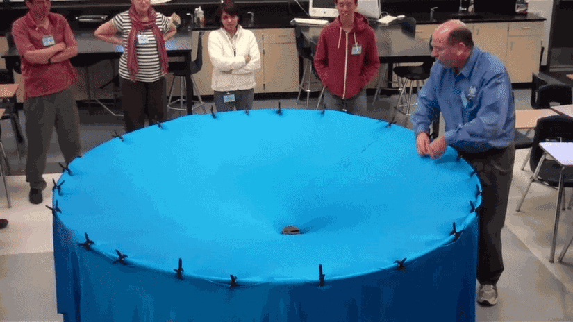 Yukarıda sözünü ettiğimiz giib gerili bir çarşaf olduğunu ve ortasında bir bovling topu veya dambıl koyduğumuzu düşünün. Çarşaf, bu kütle nedeniyle çarşaf aşağı doğru bükülmüştür. Bu, Güneş olsun. Dünya da, daha küçük ve hafif olan bir bilye olsun. Bu cisimleri çarşaf üzerinde kendi hallerine bırakacak olursanız, daha ağır olan Güneş'in olduğu yerde kaldığını, daha hafif olan Dünya'nınsa Güneş'e doğru çekildiğini görürsünüz.