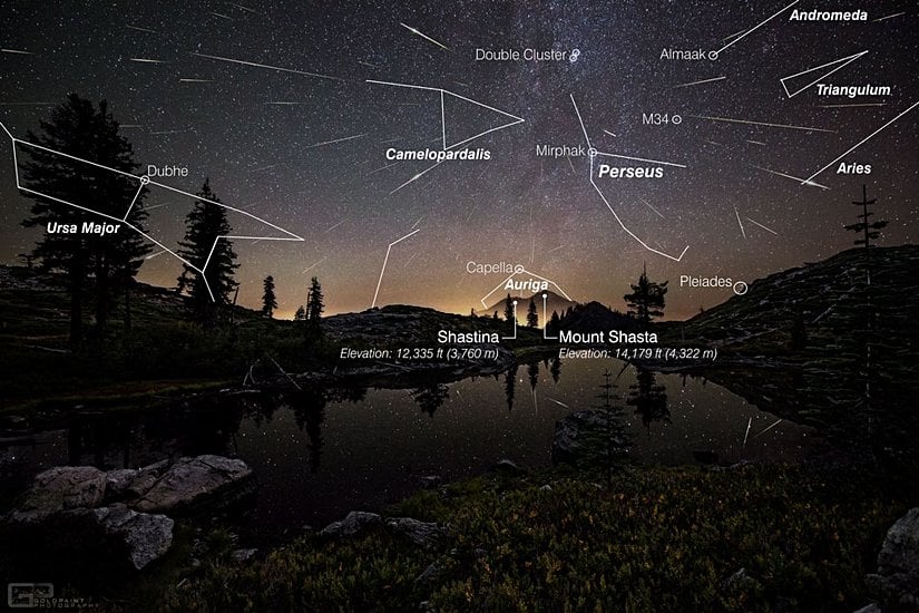 Yörünge hareketi sebebiyle bir taş bulutunun içerisine daldığımızdan dolayı, yıldız kayması olarak adlandırdığımız gök taşı yağmuru gökyüzünün spesifik bir noktasından gerçekleşir. Bir bölgeden dışarıya doğru saçılan gök taşları izlersiniz. Bu bölge, gökyüzünde hangi takım yıldıza denk geliyorsa, gök taşı yağmuruna o ad verilir. Bunlardan en bilineni, kuzey yarı kürede yaz aylarına da denk gelmesi sebebiyle rahatlıkla gözlemi yapılan, Perseid gök taşı yağmurudur. Perseid adı, üstteki görselden de göreceğiz üzere Perseus (kanatlı at) takım yıldızı bölgesinden doğru dışarıya saçılmasından kaynaklıdır.