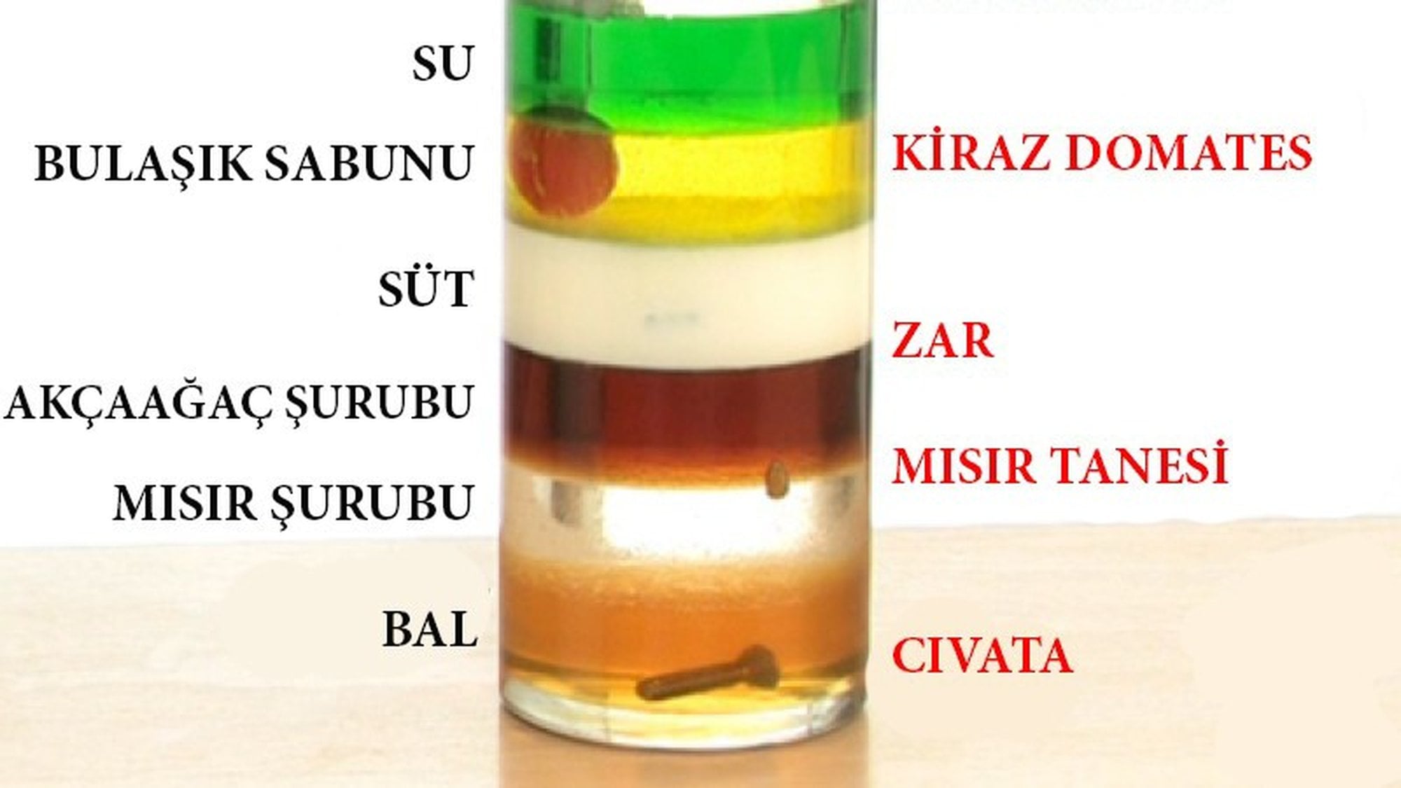 Bu fotoğrafta gördüğünüz kulede, günlük hayatta görebileceğiniz çok sayıda farklı cisim yoğunluklarına göre bir kap içerisinde belirli konumlar almaktadır. Kap içerisinde yukarıdan aşağıya doğru indikçe, karşılaştığınız cisimlerin yoğunlukları da artmaktadır. Çünkü daha yoğun olanlar, daha dibe çökmeye meyillidir; daha az yoğun olanlarsa diğerlerinin üzerinde kalırlar. Bunu siz de evinizde deneyebilir ve sonuçlarınızı bize iletebilirsiniz!