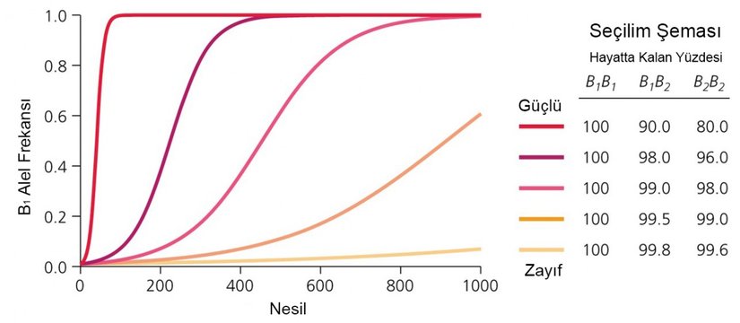 Yukarıdaki grafikten de görülebileceği gibi, sağ tarafta farklı şiddetlerdeki seçilim baskısı ve buna bağlı olarak genotiplerin hayatta kalma başarıları gösteriliyor. Örneğin en üstte bulunan en güçlü seçilim baskısı altında, bir sonraki nesilde B1B1 genotipinin %100'ü hayatta kalırken, B1B2 genotipinin %90'ı hayatta kalıyor. B2B2'nin ise sadece %80'i... Buna bağlı olarak farklı şiddetteki seçilim baskılarını farklı renklerde gösteren soldaki grafikte, değişim hızları görülüyor. Eğer ki seçilim baskısı çok şiddetliyse, sol taraftaki koyu kırmızıyla gösterilen gibi aşırı hızlı bir değişim görülüyor ve sadece 100 nesilde bile alel frekansları devasa biçimde değişiyor. Ancak seçilim baskısı azaldıkça, her ne kadar yine S şeklinde bir grafik görsek de, alellerin sabitlenmesi çok daha uzun bir süre alıyor. İşte buna bağlı olarak farklı evrim hızlarından söz edebiliyoruz. Konuyla ilgili olarak "Türleşme - 7: Evrim Hızı Tüm Canlılarda Aynı Mıdır, Farklı Mıdır? Neden?" başlıklı makalemiz de okunabilir.
