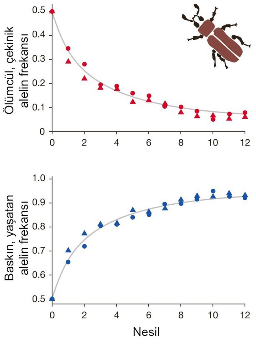Araştırılan bir Tribolium popülasyonu, tamamen heterozigotlar tarafından kurulmuştur. Bu canlıların genotiplerini yeni bir gösterim biçimiyle anlatalım: +/+ olanlar, ölümcül aleli taşımayanlardır. Bunları AA gibi düşünebilirsiniz. +/l olanlar heterozigotlardır ve çekinik olarak ölümcül aleli taşırlar. Bunları da AB gibi düşünebilirsiniz. l/l olanlar ise ölümcül aleli homozigot biçimde taşıyanlardır ki bunlar popülasyondan anında elenirler (çünkü ölürler). Bunu da BB gibi düşünebilirsiniz. Burada l harfi İngilizcede "ölümcül" anlamına gelen "lethal" sözcüğünün baş harfinden gelmektedir. Bu, yalnızca farklı bir genotip gösterim tipidir ancak çok sık kullanılır, bu yüzden öğrenmenin faydalı olacağı kanaatindeyiz.