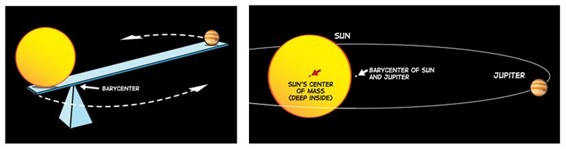 Buraya kadar gezegenlerin sistemimizde Güneş etrafında dolandığını anlattıktan sonra durumun aslında tam olarak öyle olmadığına geri dönelim. Her maddenin bir kütle merkezi vardır. Kütle merkezinin bulunduğu nokta, cismin dengeli bir şekilde, örneğin bir çubuk üzerinde durabileceği noktadır. Kütlesi her yerine eşit dağılmış cisimlerde bu nokta cismin tam merkezine denk gelir, örneğin bir cetveli tam ortasından parmağınızda tuttuğunuzda dengede tutabilirsiniz. Ancak kütlesi eşit dağılmamış cisimlerin kütle merkezi cismin geometrik merkezinde olmaz. Buna da örnek olarak bir balyozu verebiliriz. Balyozun kütle merkezi daha yoğun olan metal ucuna çok daha yakındır.