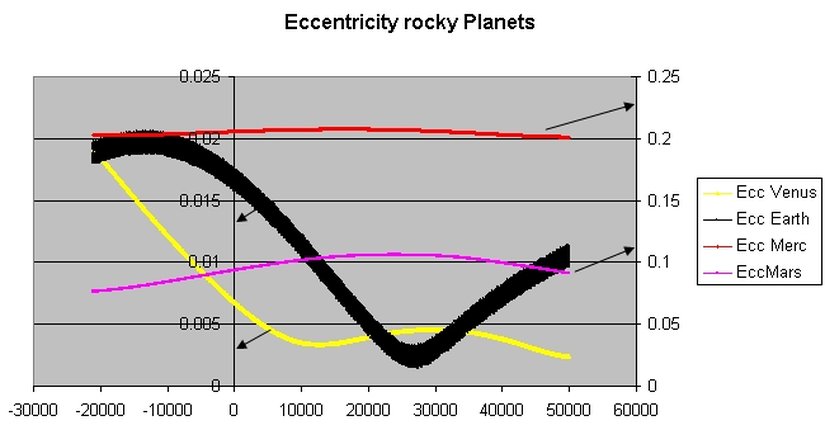 Buraya özellikle Plüton'u da dahil ettik ki gezegenlikten çıkarılması konusunda bir faktör olan bu aykırılığı bir kez daha görebilelim. Merkür'ün de oldukça eliptik bir yörüngeye sahip olduğunu görüyoruz, fakat geri kalanlar oldukça çembersel. Lakin bu değerler çeşitli etkileşimlerden dolayı zamanla bir miktar değişebiliyor ve tam olarak sabit değil. Aşağıdaki görselde, 50.000 yıl mertebesinde Merkür, Venüs, Dünya ve Mars'ın basıklık değerlerinin nasıl değişeceğini görüyoruz.