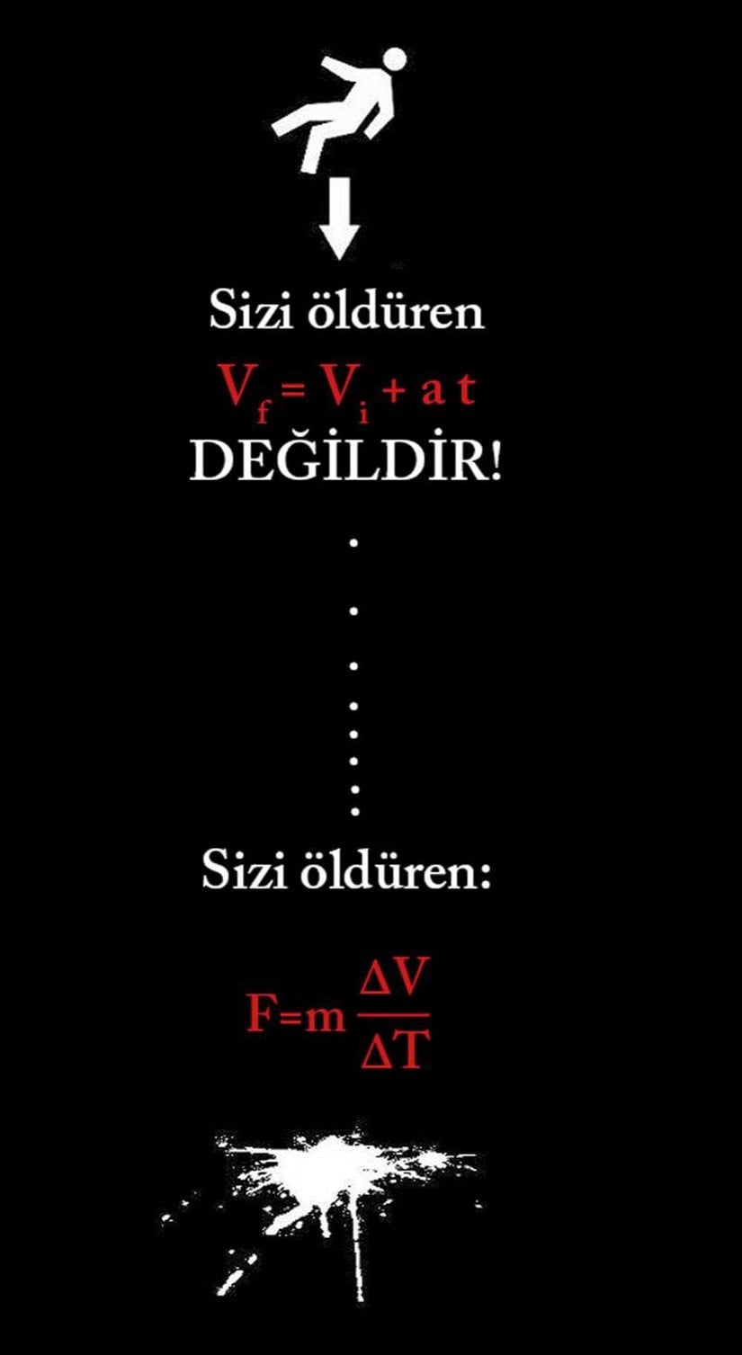 Aşağıdaki görselde, basit fizik kurallarının günlük yaşantımız üzerindeki etkisi anlatılıyor. Lisede öğrendiğimiz en temel düzeydeki hareket formülleri, yüksek bir noktadan düştüğünüzde canınızı yakan ve hatta ölmenize neden olan kuvvetlerin nereden kaynaklandığını anlamamızı sağlayabilir.