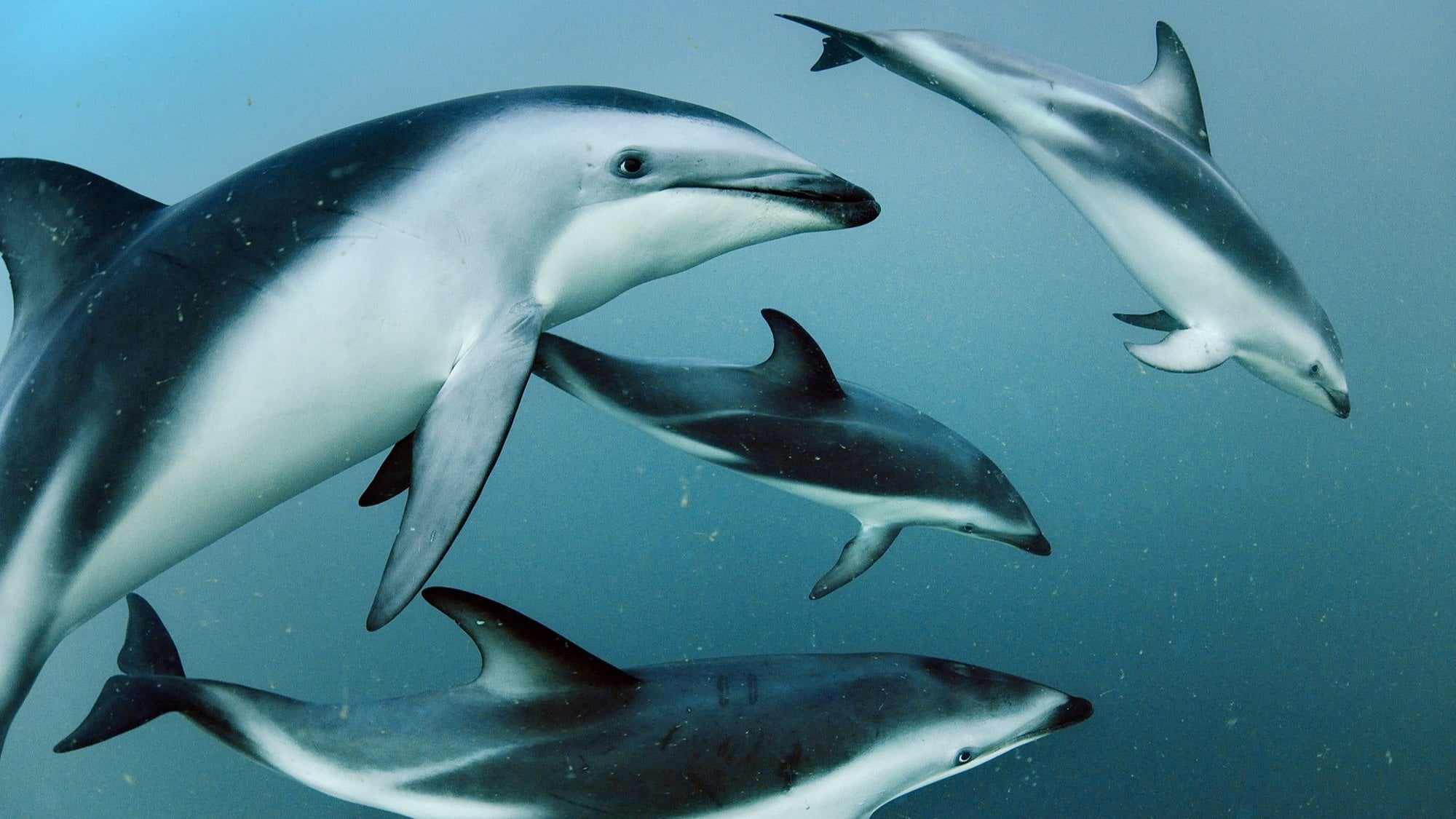Güney Amerika'ya indiğimizde, Arjantina'nın Valdes Yarımadası'nda gölgeli yunusların (Lagenorhynchus obscurus) hamsi (Engraulidae spp.) balıkları ile beslenirken kooperatif stratejiler oluşturdukları görülüyor. Balıkların bir arada toplanmasını sağlıyorlar, diğer bireyler balıkların bu pozisyonunu korurken sırayla içlerinden geçerek besleniyorlar.