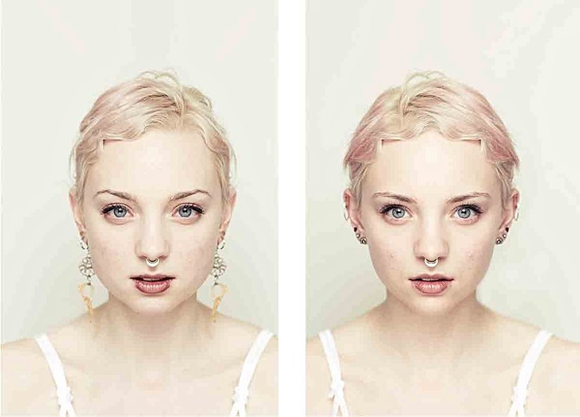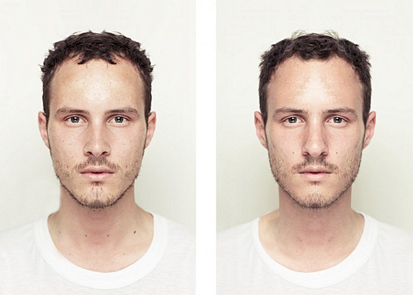 Aşağıdaki fotoğraflarda Alex Beck tarafından, katılımcıların yüzlerinin sol ve sağ yarılarına göre oluşturulan tam yüz portrelerini görüyorsunuz. Her fotoğrafta sol taraftaki kare, bireyin yüzünün sol yarısının kusursuz simetrisine, sağ taraftaki kare ise bireyin yüzünün sağ yarısının simetrisine dayanıyor.